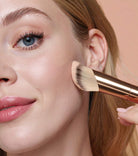 Pennello viso ideale per Skin Velvet. Forma sagomata e setole vegane ultra-soft per un’applicazione precisa, uniforme e naturale del fondotinta fluido.